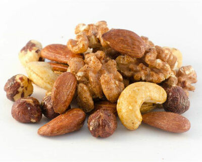 These maple glazed mixed nuts make an excellent sweet and salty treat. A combination of cashews, almonds, hazelnuts, pecans, walnuts are then roasted and glazed with maple syrup and tamari (wheat free).