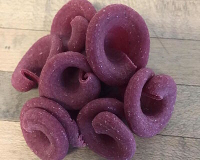 This girelle pasta is a large, semi-hollow corkscrew shape brilliantly colored by beet juice. Bold enough to stand out in any meal!