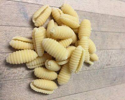This pasta is in the shape of a tightly curled shell. David and Michelle call it Gnocchi Sardi, but it's nothing like what Americans think of when they hear the term gnocchi as there is no potato in it, so we've omitted the gnocchi part to minimize confusion. This one is made with their gluten free dough and features spinach.