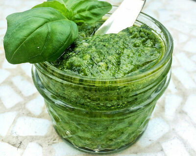 This classic basil pesto is well balanced and it's flavor is bright and refreshing. This Pesto has been processed and frozen at Pete's Greens. We pack this into your orders and keep it refrigerated, but not frozen.