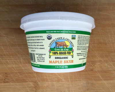 Larson Farm Maple Skyr is a drained Icelandic yogurt made from organic, 100% grass-fed Jersey cow milk. Skyr is traditionally made by first hand skimming the cream off the top of the milk and using the remaining milk to make yogurt which is drained and whipped. The result is creamy, slightly tangy and similar to a greek-style yogurt with a hint of maple.